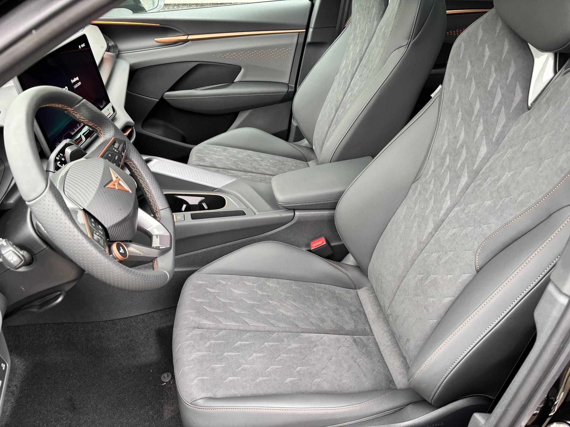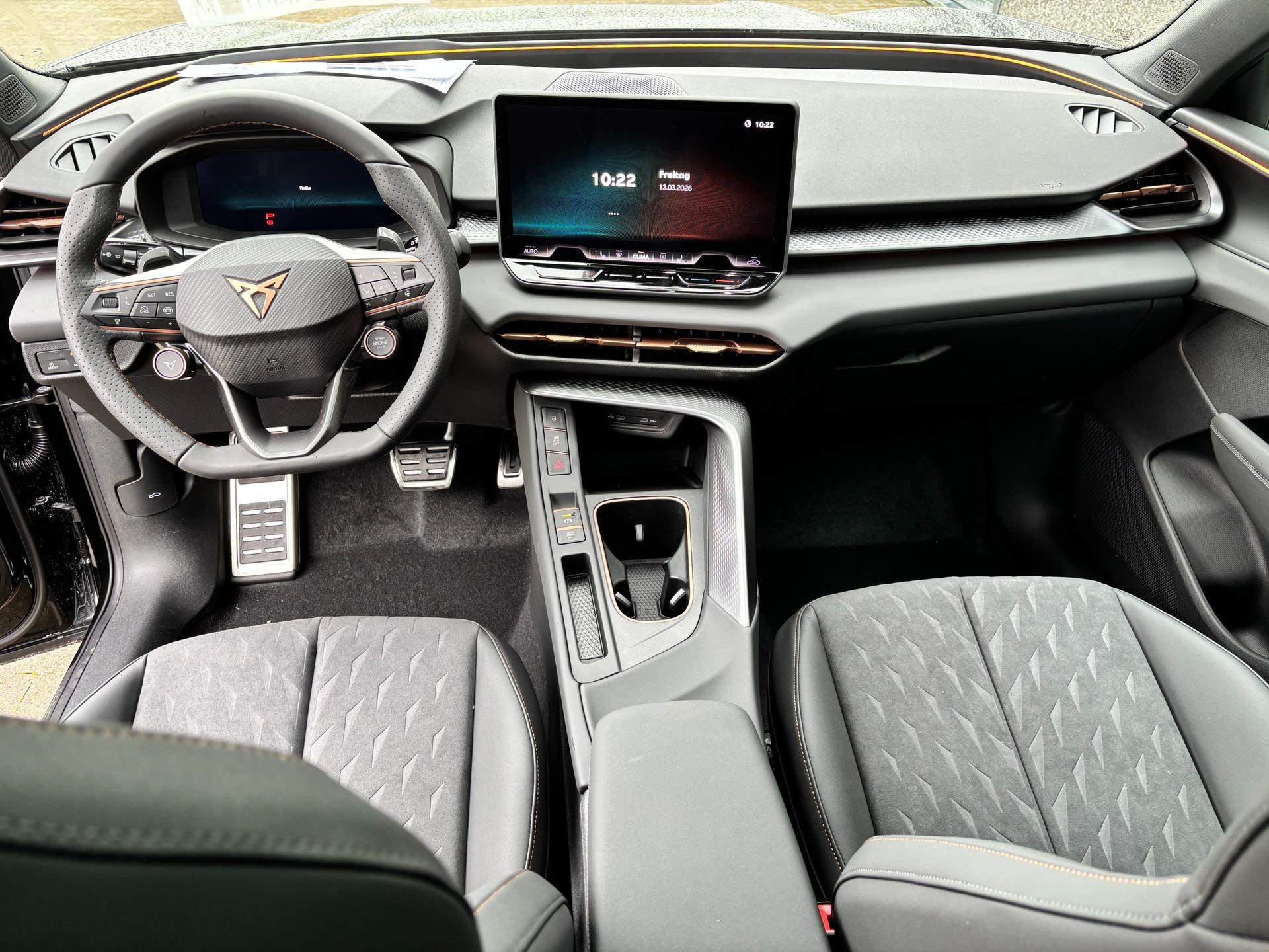Innenausstattung Interieur "Moon Light" Dinamica: Sitzfläche in Dinamica Schwarz, Nähte in Kupfer; Vordersitze elektrisch einstellbar; Fahrersitz mit Memoryfunktion; Außenspiegel mit Memoryfunktion; Sitzheizung vorne; Elektrische Lordosenstütze Vordersitze; Indirekte Beleuchtung Türen vorne und hinten; Armaturenbrett in Schwarz; Mittelkonsole in Schwarz; Türgriffe in Kunstleder Schwarz; Mittelarmlehne in Schwarz